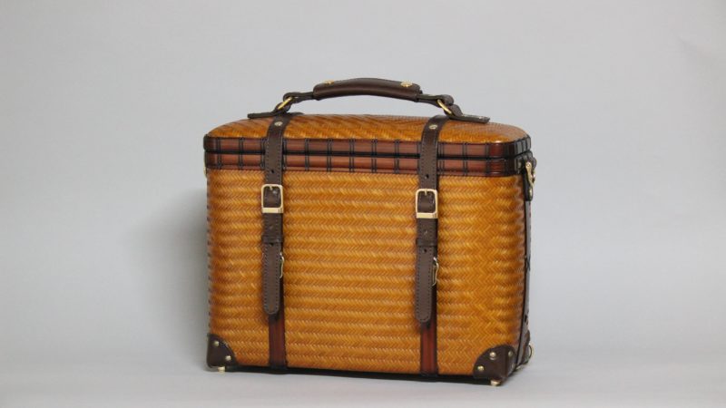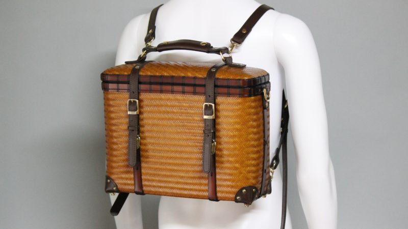 A4サイズの封筒が収まるブリーフケースです。幅約3mm、厚さ約0.2mmと細く割った竹を丹念に編み上げて作っています。一般的な竹籠バッグとは異なり、バッグに蓋があり、バッグの中(裏地)は布地を張ってポケットも配置しています。また、持ち手や角当てには牛革を使っており、竹と牛革のコラボレーションを楽しめるのも本品の魅力です。